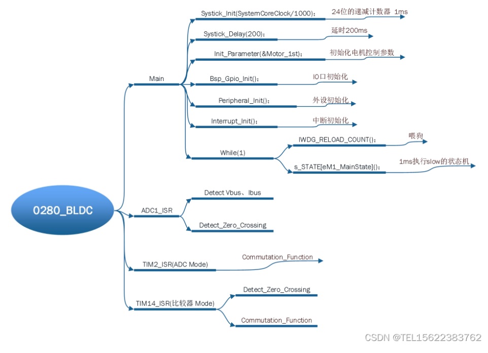 由圖可知,系統上電復位后,先執行一段延時函數,等待系統穩定后開始初始化系統外設 及參數,最后使能對應的中斷,在 while 循環中執行喂狗及 1ms 一次的慢速環狀態機。 1) ADC 法檢測過零點時,在 ADC1 中斷執行過零點檢測,在 TIM2 中執行延時和換相。 2) 比較器法檢測過零點時,在 TIM14 中斷執行過零點檢測,并執行延時和換相。