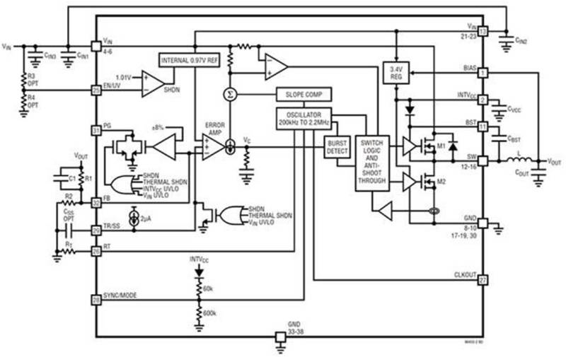 圖 1:Silent Switcher 降壓穩壓器的方框圖展示了它們的復雜度,但無法顯示用于實現重大性能改進的技術細節。(圖片來源:Analog Devices)