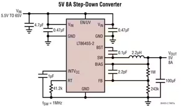 但是,隨著最近的技術進步和創新拓撲結構的問世,這種情況已經改變,LT8645S、LT8646S 和 LT8645S-2 就證明了這一點。這三款相似的 65 V 單片 Silent Switcher 同步降壓穩壓器來自于 Analog Devices,每款穩壓器都能夠支持 8 A 輸出(圖 1)。