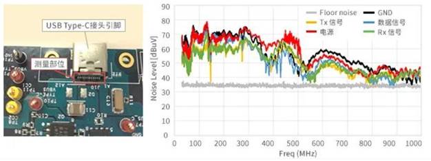 對傳導至測試基板的USB Type-C接頭引腳的噪聲進行測量,從測量結果可以確認,電源線和GND線的噪聲電平在100至300MHz的范圍內較高。