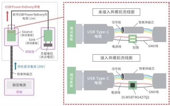 由于電源線和GND線的噪聲電平較高而導致電纜出現噪聲輻射,因此在DC-DC轉換器輸出部分的USB接頭前面接入共模扼流線圈被認為是有效的。