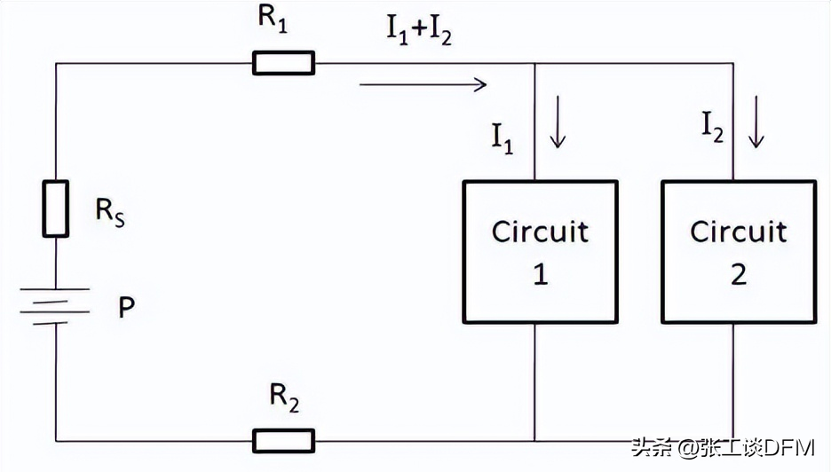 下圖顯示了通過共模阻抗進行的噪聲去耦。電路1和電路2通過同一根導線獲得電源電壓的和接地環路。如果其中一個電路的電壓突然需要提高,另一個電路將降低,因為公共電源和兩個回路之間的阻抗。
