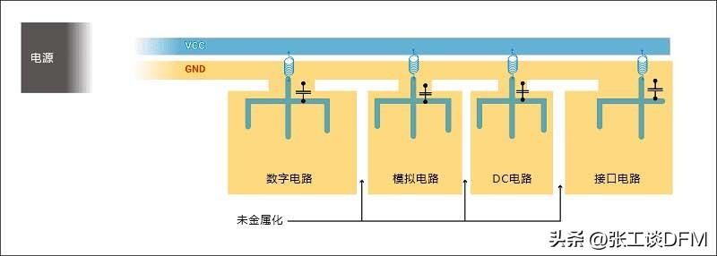 下圖說明了如何使用分段將四個不同的電路分開。地平面使用未金屬化的護城河/通道有效地隔離了電路。電感和電容對每個電路進行濾波,電源層之間的耦合減少。