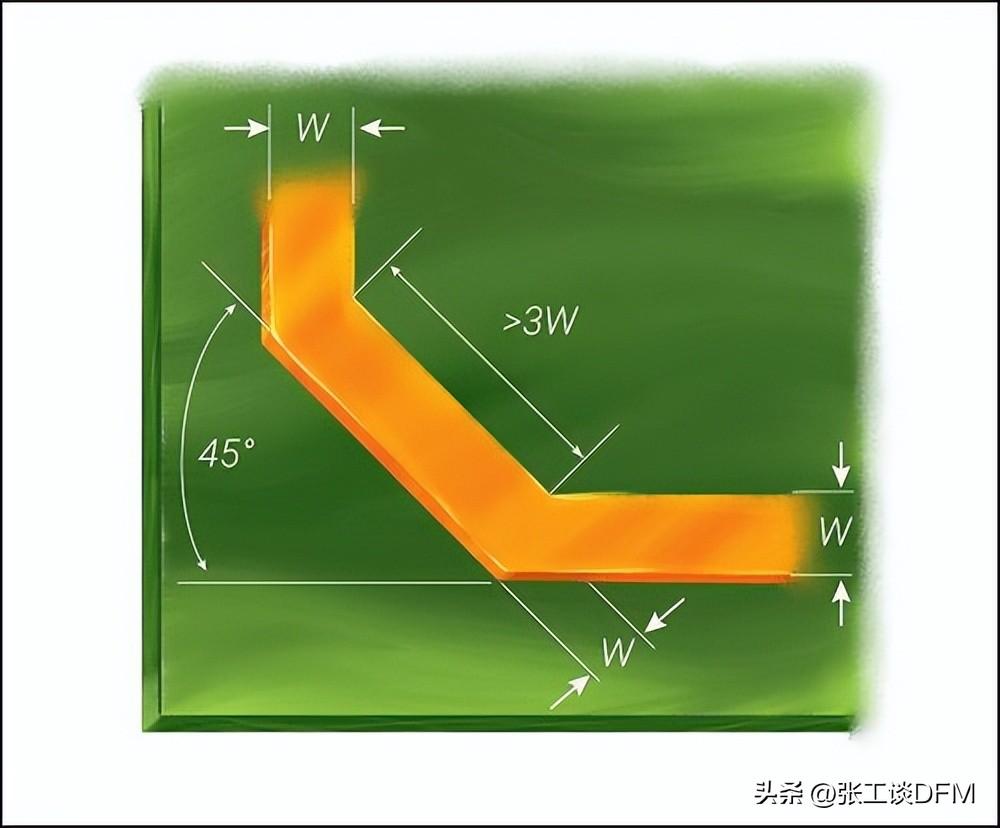 與過孔類似,不應實施直角 90° 軌道轉彎,因為它會增加寄生電容,導致特性阻抗發生變化,從而導致反射。如圖 所示,所有正交走線都應采用 45° 彎曲,以限制耦合到附近走線的噪聲。