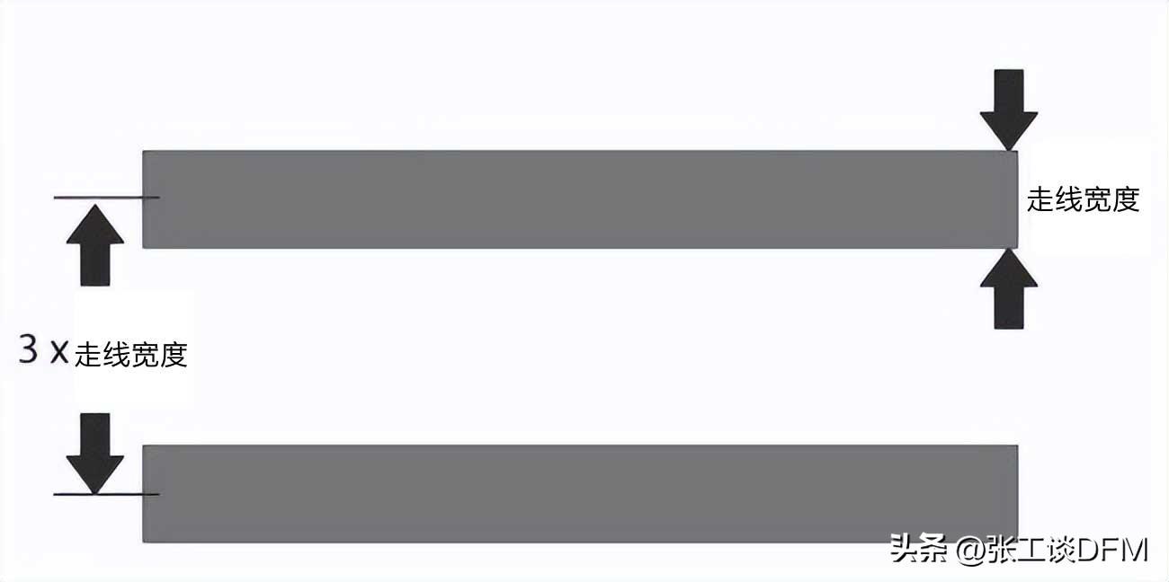 走線分離可最大限度地減少相同或不同 PCB 層上相鄰/平行跡線之間的串擾和電磁耦合。一般規則規定走線之間的間隔(在中心到中心之間測量)應大于或等于 3 x 走線寬度。間隔越大,串擾和耦合越低。