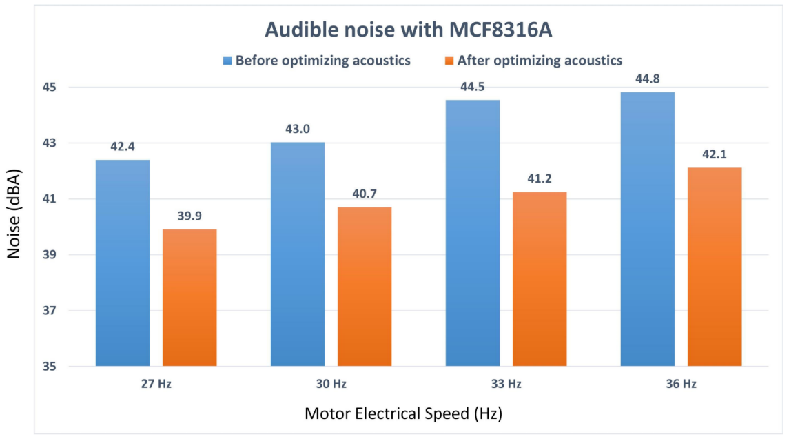 例如,TI 的 MCF8316A BLDC 集成控制柵極驅動器(一款無傳感器 FOC 電機驅動器)采用此內置功能來優化多種電機頻率下的聲學性能,如圖 6 所示。