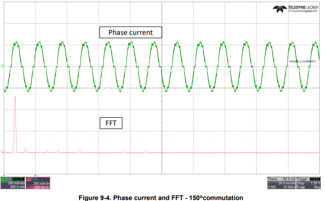 用于降低電機控制應用中可聞噪聲的最后一種策略是可變換向模式。在梯形換向中,有兩種主要配置:120 度和 150 度。120 度梯形換向可能會導致更多的聲學噪聲,因為較長的高阻抗周期會導致扭矩波紋增大,如圖 7 和 8 所示。150 度梯形換向只能在低速下運行,因為檢測過零的窗口期很短。