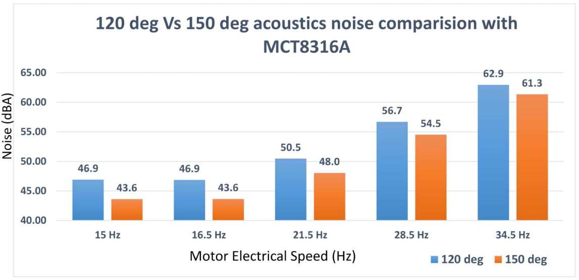為了應對這些挑戰并提高聲學性能,工程師可以構建能夠在 120 度梯形換向和 150 度梯形換向之間動態切換的電機驅動器系統。這種動態調制可以改善 BLDC 電機控制期間的整體聲學性能。