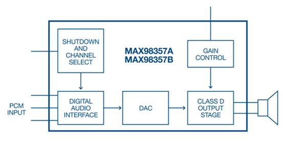德州儀器 (Texas Instruments)的TAS277015W輸入音頻放大器能夠提高響度和音頻質量,它具有更強的語音捕獲能力,意味著語音控制設備的操作更容易、更自然。Maxim Integrated(現在屬于Analog Devices旗下品牌)開發了MAX98357 和MAX98358 D類放大器,效率達到92%,可提供3.2W的AB類音頻性能,這些放大器的簡化框圖如圖2所示。Diodes Incorporated的PAM8106具有較低功耗,使其能夠在由1.5V鉛酸電池和3.5V鋰離子電池驅動的設備中很好地運行。