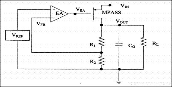 如今的LDO電路具有體積小,噪聲低,功耗低,價格低廉,使用方便等特點(diǎn),但其基本的結(jié)構(gòu)比較簡單,包含了電壓基準(zhǔn)源(VREF),誤差放大器(EA),調(diào)整管(MPASS),反饋電阻(Rl,R2)四個模塊,如下圖所示。其中: