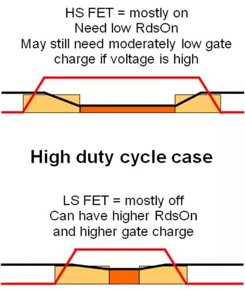 低占空比設計意味著高輸入電壓,對這些設計而言,高側 FET 大多時候均為關斷,因此 DC 損耗較低。但是,高 FET 電壓帶來高 AC 損耗,所以可以選擇低柵極電荷的 FET,即使導通電阻較高。低側 FET 大多數時候均為導通狀態,但是 AC 損耗卻。這是因為,導通/關斷期間低側 FET 的電壓因 FET 體二極管而非常地低。因此,需要選擇一個低導通電阻的 FET,并且柵極電荷可以很高。圖 7 顯示了上述情況。