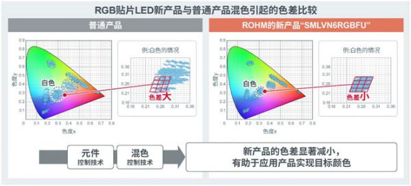近年來,隨著汽車電子化程度的提高和功能多樣化的發(fā)展,車速自動控制、車距檢測、車道線檢測等各種駕駛輔助功能得以廣泛應(yīng)用。為了用儀表盤等的指示燈顯示這些功能的工作狀態(tài),業(yè)內(nèi)對于能夠表現(xiàn)各種顏色的RGB貼片LED的需求日益高漲。另外,對使用RGB貼片LED來打造車內(nèi)空間的舒適感和奢華感的內(nèi)飾產(chǎn)品的需求也在不斷增加。在這種背景下,ROHM利用自有的元件技術(shù),通過精細(xì)地控制RGB元件的發(fā)光特性并提高混色性能,開發(fā)出色差更小的RGB貼片LED。