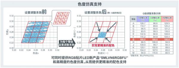 SMLVN6RGBFU為每個(gè)色度等級設(shè)置了調(diào)整系數(shù),并提供更接近目標(biāo)顏色的配色支持。通過同時(shí)提供RGB貼片LED新產(chǎn)品和高精度的色度仿真,可以實(shí)現(xiàn)更精細(xì)的配色效果。