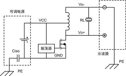 究其原因,如圖1所示,可調(diào)電源對(duì)保護(hù)接地線PE實(shí)際上存在電容,以下稱為Ciso,而示波器探頭負(fù)端是接PE的,在高頻下,探頭負(fù)端→PE→Ciso→GND形成一條低阻抗通路。電路的Vo+和Vo-對(duì)GND都存在100kHz的電壓,無論探頭負(fù)端接Vo+或Vo-,都產(chǎn)生額外的電流通過探頭負(fù)端→PE→Ciso→GND,在電感的電阻和回路電阻上產(chǎn)生熱量,使電源電流增大,另外并聯(lián)的低阻抗通道改變了驅(qū)動(dòng)器的諧振狀態(tài)。所以并非是示波器的問題,而是不正確的測(cè)量方法導(dǎo)致。