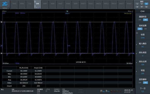 3、類似實(shí)例2的情況,可使用ZP1500D高壓差分探頭及ZDS4000系列示波器進(jìn)行測(cè)量。ZP1500D可用于1000V CAT II或600V CAT III的場(chǎng)合。