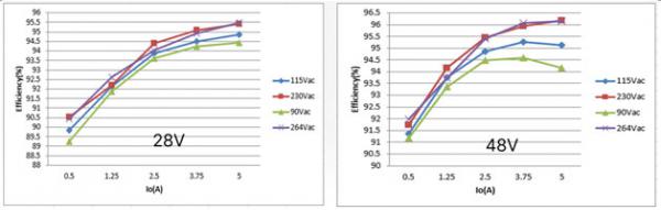該方案在230Vac和5V輸出沒接負載的情況下,輸入功率小于100mW, 待機功耗及48V下PF曲線如下圖。在5V小負載下的效率及各個輸出下0.25W的效率也很好。在115 VAC(藍色曲線)和230 VAC (紅色曲線)輸入電壓的平均能效和輕載(10%負載)能效,從下面曲線圖可看到都遠高于COC V5 Tier 2平均能效標準和COC V5 Tier 2輕載能效標準,由于PFC在5V,9V,12V時停止工作,所以可以看到這幾個電壓下效率較高,28V和48V滿載下的效率也非常高。