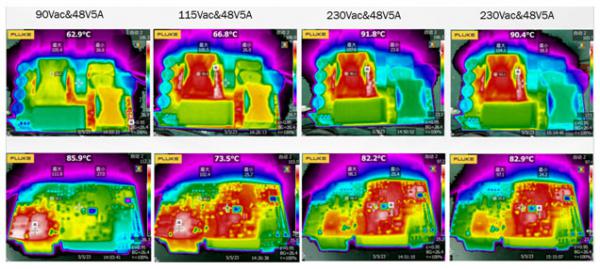 由于非常高的效率,該方案在沒有加任何導熱材料及主動散熱的情況下,靠自然散熱得到下列的熱成像圖,該熱成像圖是在滿載工作30分鐘后測得。