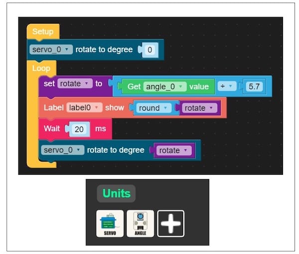 將電位器連接到 M5Stack 內核后,需要軟件來顯示電氣元件的旋轉值。UiFlow 軟件將用于顯示電位器的旋轉角度(以度為單位),代碼塊包含伺服電機控制器的三個主要操作。