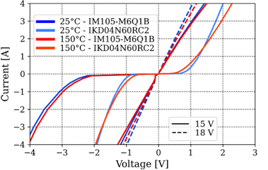 第一個輸出特性圖如圖2所示。可以看出,在第一象限運行中,IM105-M6Q1B的壓降大大低于(約4A)IKD04N60RC2的壓降。此外,通常情況下,IM105-M6Q1B的RDS(on)溫度依賴性在Vgs = 15 V時僅為0.11 mΩ/°C,在Vgs = 18 V時略高,為0.2 mΩ/℃。這凸顯了CoolSiCTM技術的溫度依賴性極小的特征。另一方面,在二極管導通期間的第三象限運行中,IM105-M6Q1B的壓降高于IKD04N60RC2。然而,請注意,二極管僅在死區時間內導通,在應用條件下,死區時間約在0.5到1 µs之間,因此,其造成的損耗微不足道。當SiC MOSFET溝道在第三象限運行中導通時,壓降略低于第一象限運行中的壓降。