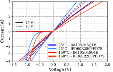 圖3所示為第二個比較圖。顯然,在Tj = 25°C條件下,IPD60R280PFD7S在第一象限運行中的壓降低于IM105-M6Q1B。當Vgs = 10 V且Tj = 25°C時,IPD60R280PFD7S的典型RDS(on)為233 mΩ。如其數據表所列,對于這種器件類型,增加柵極偏壓并不會進一步降低壓降。除此之外,還可以看出,IPD60R280PFD7S的壓降溫度依賴性明顯高于IM105-M6Q1B。IPD60R280PFD7S的典型RDS(on)溫度依賴性約為2.53 mΩ/°C,因此當結溫升高時,其導通損耗將高于IM105-M6Q1B。同樣地,當二極管加正向偏壓時,IPD60R280PFD7S的壓降低于IM105-M6Q1B。