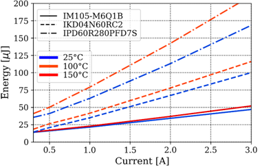 測試表明,相比于IKD04N60RC2,特別是相比于IPD60R280PFD7S,IM105-M6Q1B的功率損耗低得多,其功率損耗主要取決于導通損耗。最后,IM105-M6Q1B的動態損耗對溫度的依賴性可以忽略不計,而其他器件,哪怕當Tj=100°C時,損耗也開始顯著增加。