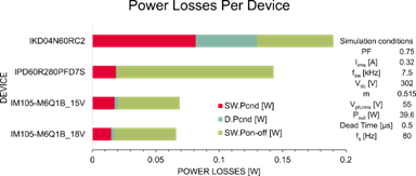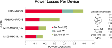 逆變器級的效率計算如表1所示。本分析考慮了一個兩電平三相逆變器,即,總共6顆器件。在標稱負載下,IM105-M6Q1B的總效率增加量比IKD04N60RC2多2.7%,比IPD60R280PFD7S多近1%。在高負載條件下,相比于IKD04N60RC2和IPD60R280PFD7S,效率分別增加了約為1.5%和0.5%。