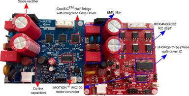 本小節討論了IM105-M6Q1B在外形(即,功率密度)方面的額外好處。此外,利用IKD04N60RC2和IM105-M6Q1B,對采用類似設計的低功率驅動板的無散熱片輸出功率能力進行了比較分析。圖7并排顯示了這兩個驅動板的圖片,以便清楚地突出顯示它們的差異。兩個驅動板都搭載了類似的電磁干擾(EMI)濾波器、二極管整流器、DC link電容器和單片機IMC101T-038(iMOTION™  IMC100系列電機控制器)。