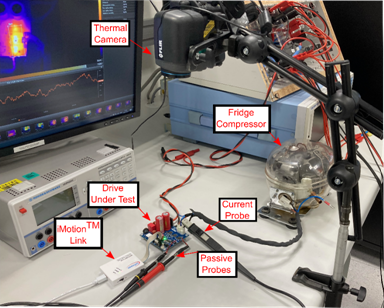 為了研究和分析驅動器在測試條件下的性能,選擇了一個典型的冰箱壓縮機。圖8所示為將冰箱壓縮機用作負載的實驗室試驗臺。使用熱像儀來監測逆變器的頂部殼溫。控制方案實現采用了英飛凌的iMOTIONTM IMC101T-T038單片機和隔離式調試探頭iMOTIONTM Link。被測驅動器直接向DC link供電,以避免任何電網電壓波動或負載對電壓造成影響,并且支持使用標準無源探頭,而不需要浮地的測量設備。將無源探測器連接至低邊功率器件,以測量器件的典型dv/dt行為。最后,在輸出相中連接一個電流探頭,用于監測電機電流。
