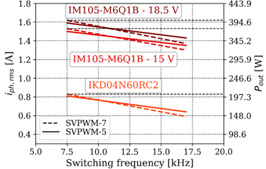 圖9所示為輸出功率能力。圖中的輸出功率計算考慮了PF為0.75且調幅指數為1。顯而易見,IM105-M6Q1B的輸出功率幾乎是IKD04N60RC2驅動板的兩倍,這也證明其功率密度更高。相比于在Vgs=15V條件下的測試,在這項測試中,柵極電壓增至約Vgs=18.5V,這使得輸出功率增加了6%。