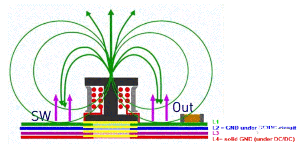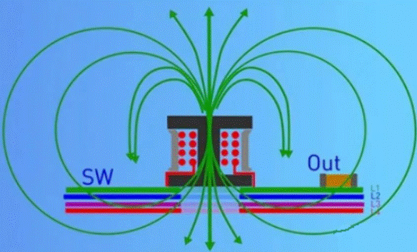 當(dāng)Boost升壓正常工作時(shí),電感中流過(guò)負(fù)載電流,形成回路。由于開(kāi)關(guān)管的存在,電流是動(dòng)態(tài)變化的,由此可形成電感的磁感線,在導(dǎo)體的表面部分磁感線回形成封閉的磁回路,部分磁路會(huì)形成漏磁溢出到空氣中。如果電感底部沒(méi)有敷銅時(shí),從電感中溢出的磁感線會(huì)在整個(gè)電源系統(tǒng)中存在,使系統(tǒng)沒(méi)有相對(duì)安靜的空間,會(huì)造成EMI的性能下降。