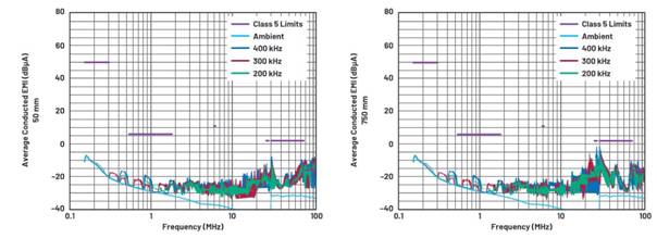 降低開關頻率可以降低給定高頻下的發射能量。在圖6中,對不使用CM扼流圈的電路執行電流探頭CE測試,并比較在200 kHz、300 kHz和400 kHz開關頻率下的測試結果。除RT外的所有組件都保持不變。測試結果顯示,200 kHz時FM頻段內的EMI最低,與400 kHz時相比,輻射降低3.2 dB。