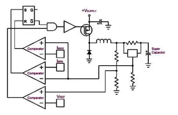充電電路需要一個能夠獨立于輸出電壓調節電容器充電電流的系統,并且僅使用電壓反饋作為確定充電何時完成的手段。圖 1 顯示了如何使用典型 SMPS 設計的變化來實現這一點。這里,通過將電感器中的電流與兩個固定水平進行比較來調節電感器中的電流;一個處于所需電流,另一個處于電流。