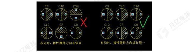 1)極性器件的方向不要超過2種,最好都進(jìn)行統(tǒng)一方向等要求,如圖1-1所示;