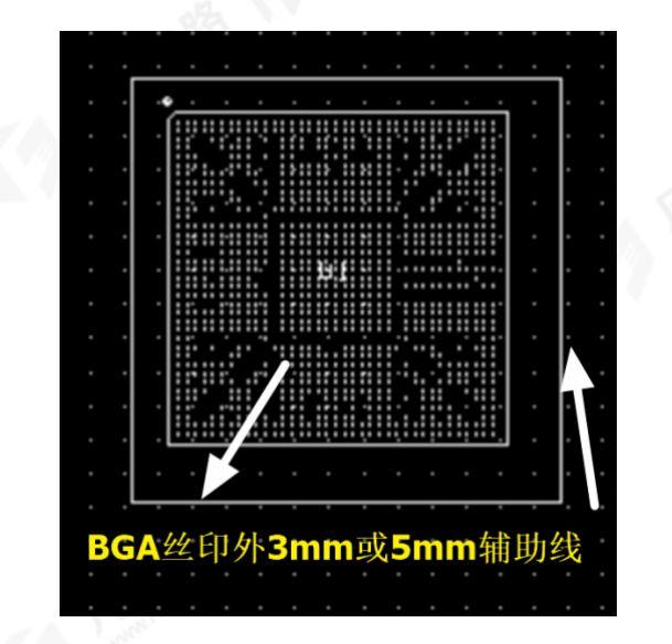 5)BGA器件:同面器件布局在BGA器件周邊5mm以外,在空間擁擠的情況下,同面器件也可布局在3mm以外,如圖1-5所示。