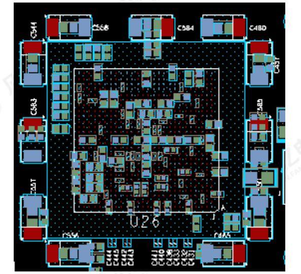 6)BGA器件的電源濾波電容背面布局,盡量靠近相應(yīng)的電源管腳布局,布局在BGA的兩相鄰焊盤的對(duì)稱中心上,(部分客戶要求:不要蓋住BGA的焊盤,避免作X射線檢測時(shí)照射不到BGA的焊盤)。如圖1-6所示。