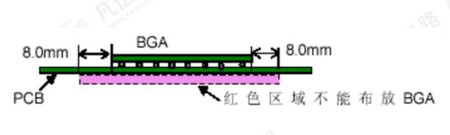 7)BGA器件雙面布局,一般情況下, BGA器件不允許布局在背面,當(dāng)背面有布局BGA器件時(shí),不能在正面BGA器件周圍8mm的投影范圍內(nèi)放置BGA器件,圖1-7所示。