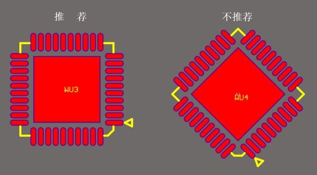 11)推薦器件布局方向?yàn)?度,90度,除非特殊情況,請(qǐng)不要45°擺放,如圖1-12所示。