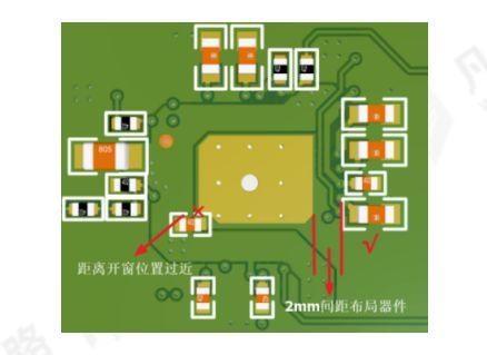 13)有開窗的PCB的布局對(duì)有開窗要求的PCB,布局時(shí)器件離開窗處確保至少有2mm以上的距離,如圖1-14所示。