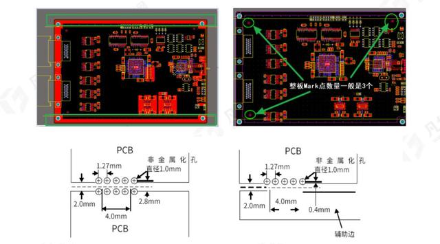14)板邊5mm內(nèi)沒貼片器件可不加5mm傳送邊,以節(jié)約板材,但是如果有,直接建議客戶進(jìn)行添加工藝輔助邊;一般長邊做傳送邊,短邊與長邊比大于80%時(shí),短邊也可做傳送邊。器件布局不能滿足傳送邊寬度要求(板邊5mm禁布)時(shí),應(yīng)該采用加輔助邊的方法。添加輔助邊的寬度一般要求:無需拼板的PCB輔助邊的寬度為5mm,拼板的PCB輔助邊的寬度最小為8mm。如果采用郵票孔的拼版方式,請(qǐng)注意郵票孔的參數(shù)設(shè)置。