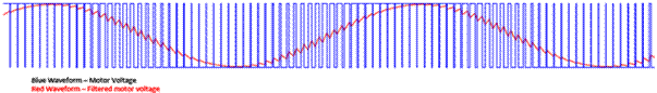 用于降低電機控制應用中可聞噪聲的第一種策略是連續 PWM。PWM是一種技術,通過導通和關斷晶體管來產生輸出波形,從而讓電機電壓在給定時間處于高電壓或低電壓狀態。然后,電機中的電感對這些波形進行濾波,以便基本上平均輸出波形。調整占空比(波形導通時間與關斷時間之比)將改變平均電壓。圖2 展示了使用 PWM 生成正弦波的一個示例。