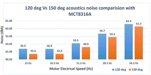 為了應對這些挑戰并提高聲學性能,工程師可以構建能夠在 120 度梯形換向和 150 度梯形換向之間動態切換的電機驅動器系統。這種動態調制可以改善BLDC 電機控制期間的整體聲學性能。