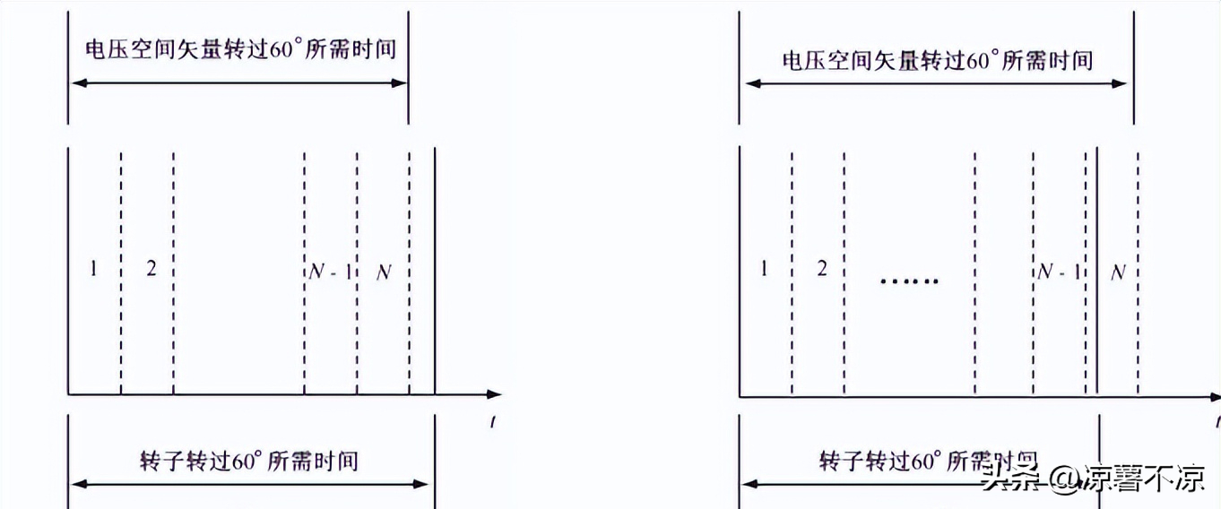 每個(gè)小區(qū)間通過(guò)相鄰兩基本矢量和零矢量的組合來(lái)合成該區(qū)間的電壓空間矢量,這樣一個(gè)周期將有6N個(gè)電壓空間矢量,每隔60/N電角切換一次。