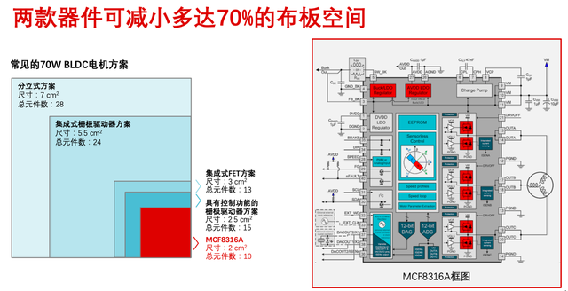為什么TI的芯片能夠如此大幅度減小尺寸?這是因?yàn)槠毡閬碚f,70W BLDC電機(jī)驅(qū)動全分立方案包含MCU、MOSFET功率器件、門極驅(qū)動三部分,這種情況下總元器件數(shù)需要28個,尺寸將近7平方厘米。如果將方案進(jìn)一步集成,便可獲得更少的器件和更小的面積。
