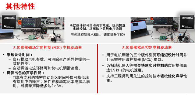 兩款產(chǎn)品也各具特色,MCF8316A作為一款無傳感器磁場定向控制(FOC)電機(jī)驅(qū)動器,在電機(jī)啟動時能夠自動識別電機(jī)參數(shù),解決參數(shù)不一致的擔(dān)憂,同時自動配置PI參數(shù),無需工程師逐一修正;另外,該芯片可以通過自動死區(qū)時間不長,將噪聲降低多達(dá)2dbA。