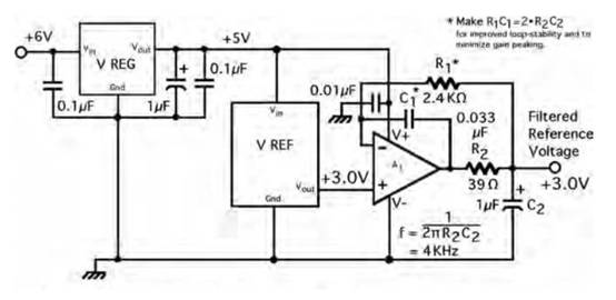 請注意,如圖 6 所示,我們可以使用低成本線性穩壓器為基準電壓源和運算放大器提供干凈的電源電壓。另外,選擇R 1 C 1 =2R 2 C 2 可以提高濾波器的環路穩定性。