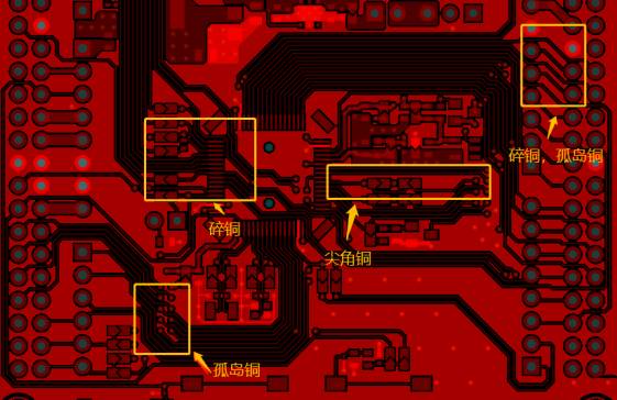 但需要注意的是我們在鋪設整版銅皮的時候需要把“沒用”的銅皮給挖掉,比如一些碎銅,尖角銅皮,孤島銅等等,這些銅皮不僅提供不了屏蔽的效果,還會影響信號質量。