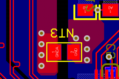 分離地平面:將地線分為模擬地和數字地兩個區域,并使用兩個獨立的地平面來布線。這樣可以防止模擬信號和數字信號間的互相干擾,其中,模擬地與數字地的距離不下于1mm,由于結構限制畫不了這么寬的則可適當的減小。