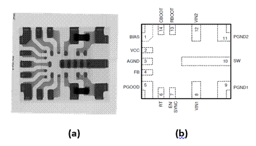 LMQ61460-Q1 降壓靜音轉換器圖 2 X 射線圖像顯示了帶有集成電容器 (a) 的 LMQ61460-Q1 降壓靜音轉換器,您可以將其與引腳排列參考 (b) 進行比較。資料德州儀器雖然 EMI 確實給汽車應用帶來了挑戰,但如果設計工程師遇到電路板布局限制,他們也并非沒有選擇。有很多方法可以應對這一挑戰,從戰略器件引腳排列到低電感封裝、轉換速率控制、擴頻和集成電容器等集成功能。
