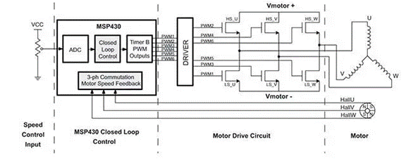 圖 2:三相 BLDC 電機的典型閉環控制系統包括控制器、驅動器和功率晶體管半橋 H。(圖片:德州儀器)