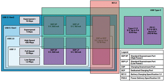 隨著時間推移,消費者開始要求USB提供更多功能。他們想通過USB電纜快速給電池充電,此時500 mA最大電流已經無法滿足要求。BC1.2標準允許通過USB電纜傳輸高達7.5 W功率——5 V電壓 和1.5 A電流,該標準滿足了這些消費者的需求。BC1.2標準擴展了通過USB電纜為電池充電的能力,在BC1.2標準之后,每一項新標準都在之前的基礎上增加了功率容量。Type-C 1.3將功率容量擴展到15 W(最大值),而USB PD 3.0使系統功率升級達到100 W(最大值)。其最新的規格更新USB PD3.1將功率容量進一步擴展到了 240 W(最大值)。